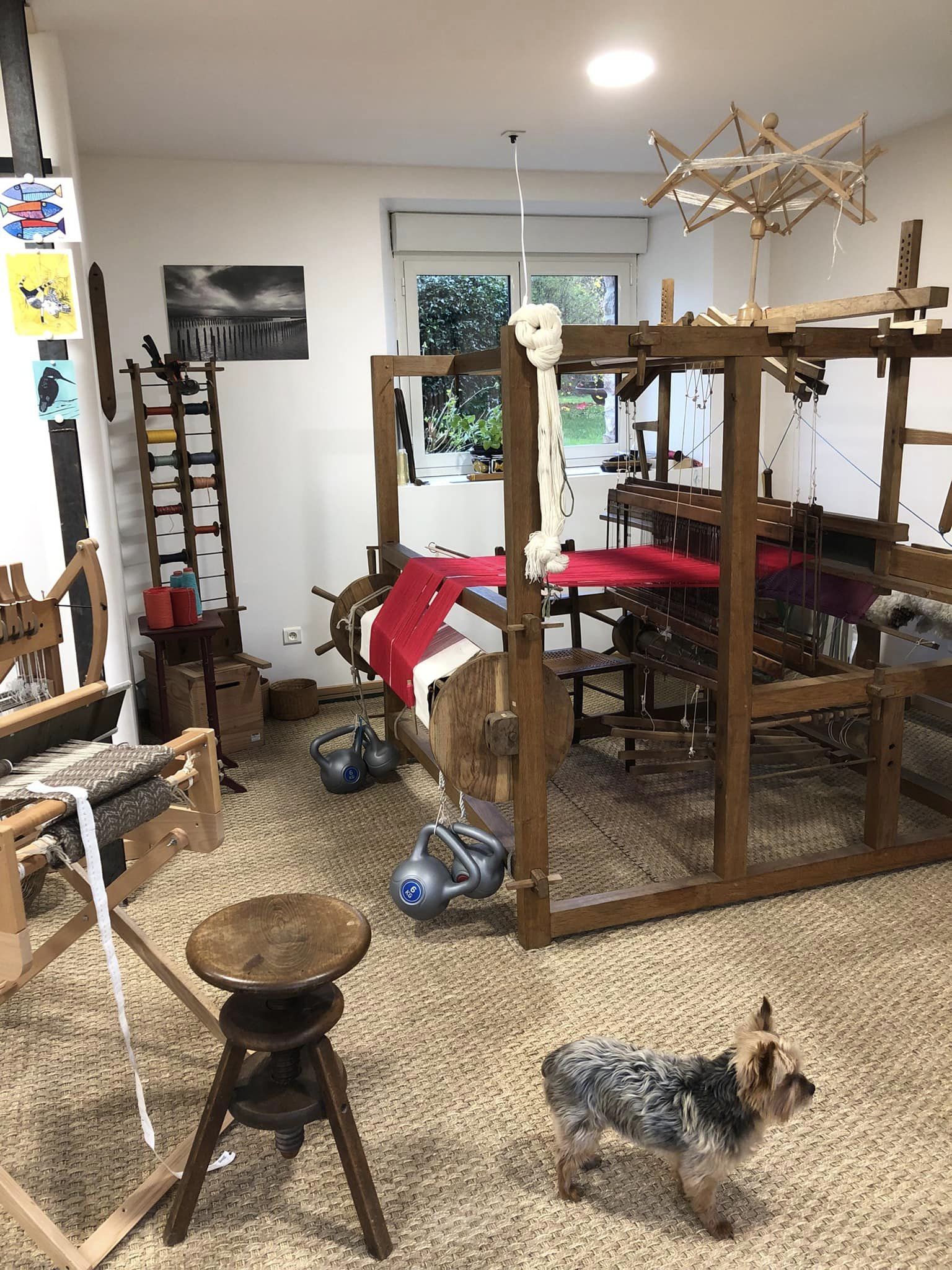 Son atelier, qui accueil ses métiers à tisser, est situé dans une ancienne grange réhabilitée.