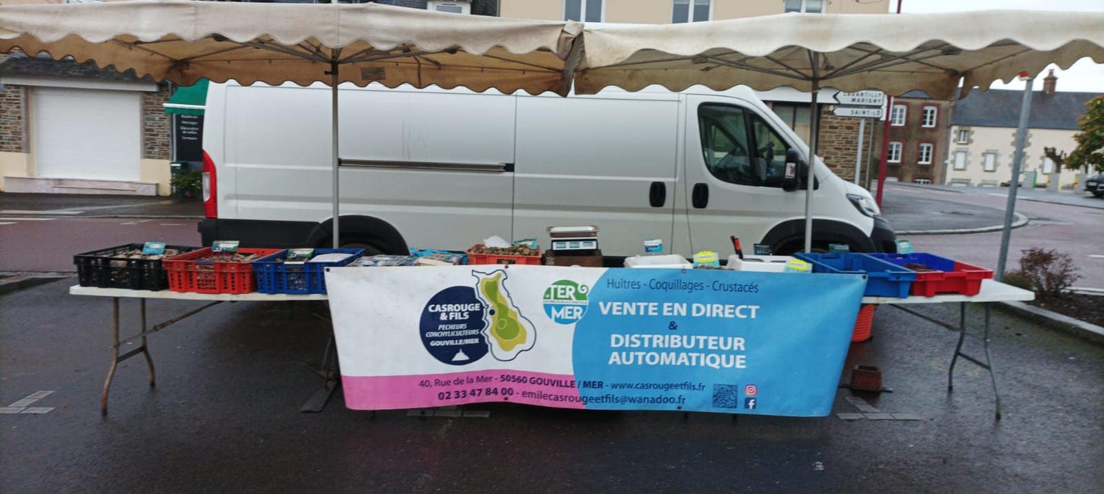 Vous retrouverez en effet nos huîtres, bulots, crevettes et autres fruits de mer ainsi que les soupes Perard, et produits de la maison St-lo (conserveries & poissons fumés).