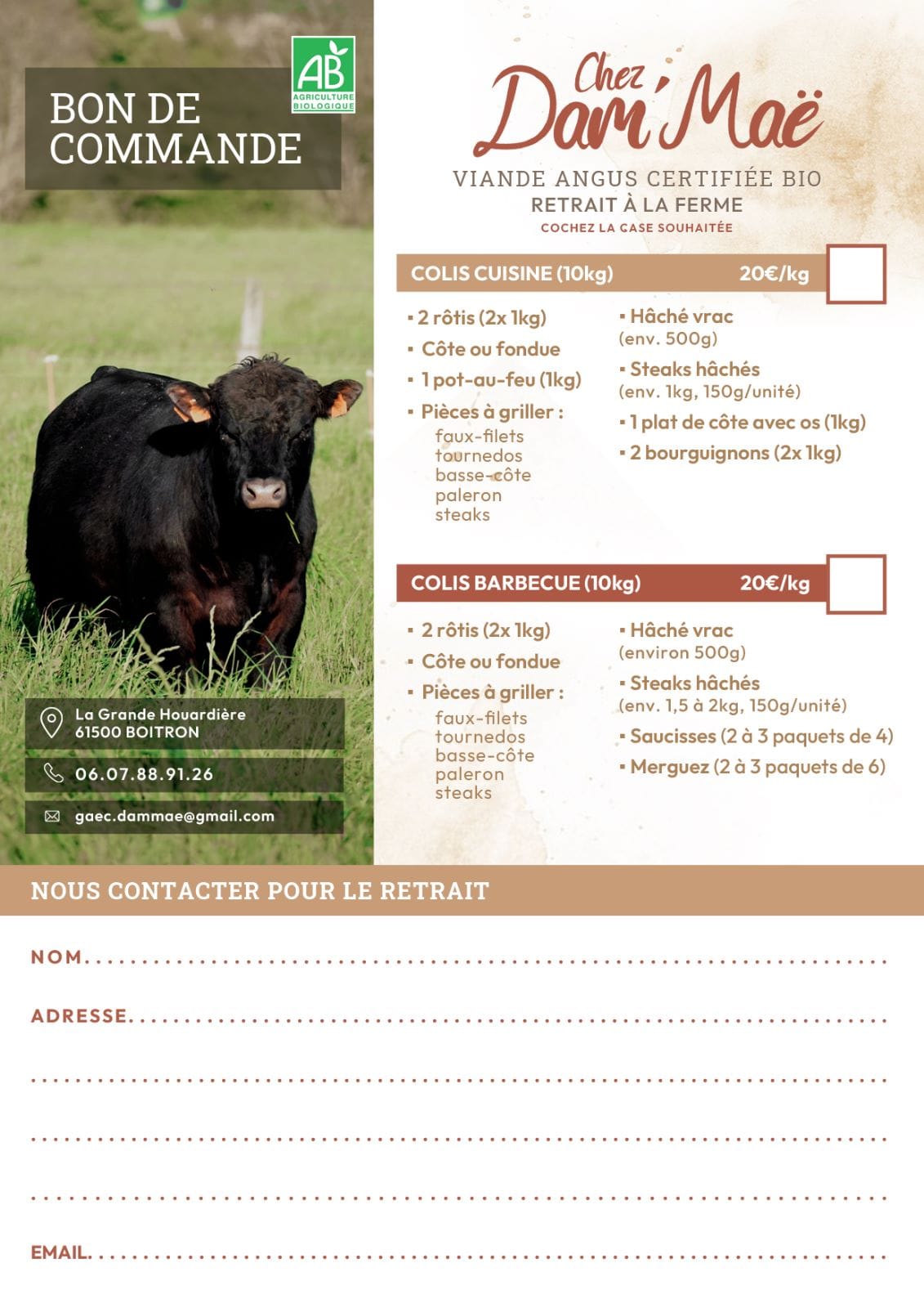 Damien et Maëva, Chez Dam'Maë, vous proposent une gamme de produits fermiers de qualité issus de leur exploitation agricole certifiée biologique, située à Boitron dans l'Orne.