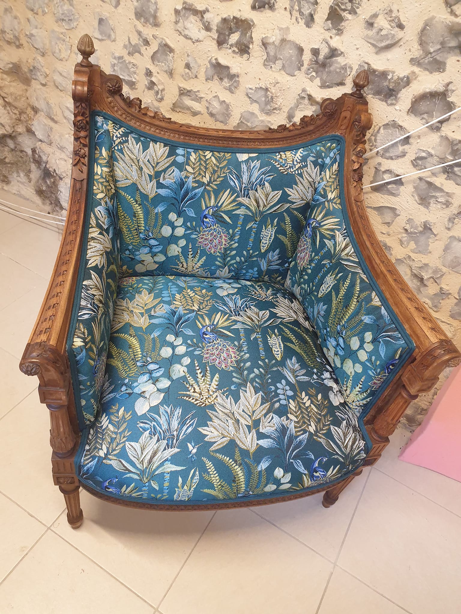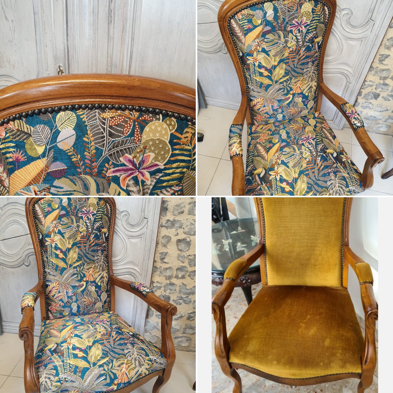 Je restaure toutes sortes de fauteuils. Je réalise également des travaux de décoration d'intérieur (teinture murale, papier peint, rideaux, voilage, store-bateau).
