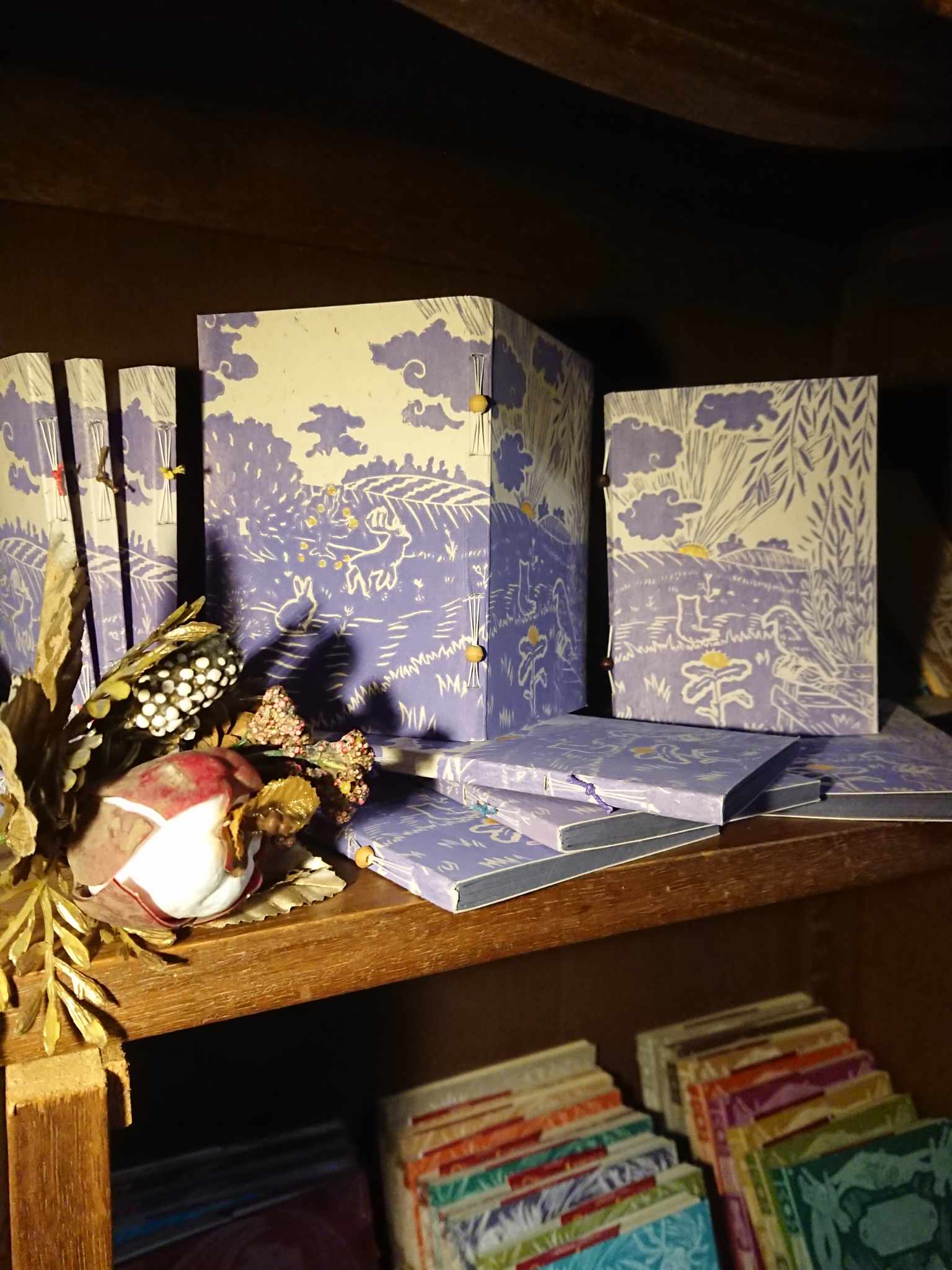J’y confectionne des carnets uniques, offre à vos livres anciens une nouvelle peau et peints des étendards porteurs de récits poétiques évoquant l’histoire de l’Humanité et de la Nature mêlé.