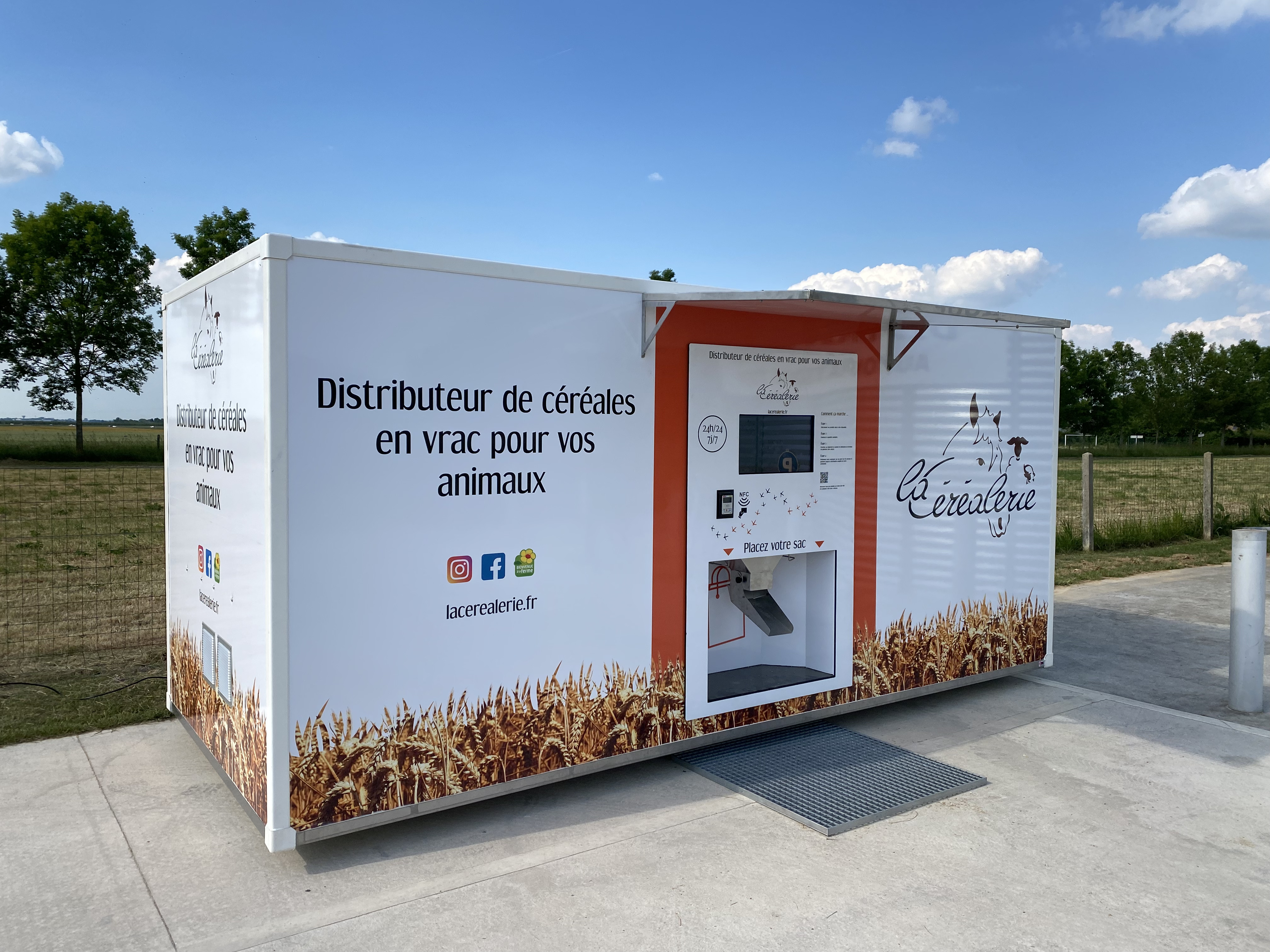 Situés à l'entrée de l'exploitation familiale, les distributeurs automatiques de La Céréalerie, vous permet d'acheter des sacs ou du vrac de nos produits : céréales et mélanges pour l'alimentation animale, fourrages, litières... tous les jours et à n'importe quelle heure.