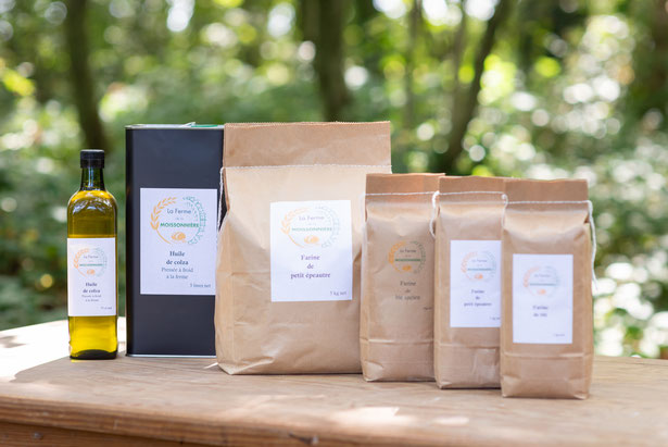 Pour le moment, nous vendons quatre sortes de farines (blé, blé ancien, petit épeautre et sarrasin) et de l'huile de colza, transformés à la ferme à partir de nos céréales et oléagineux.