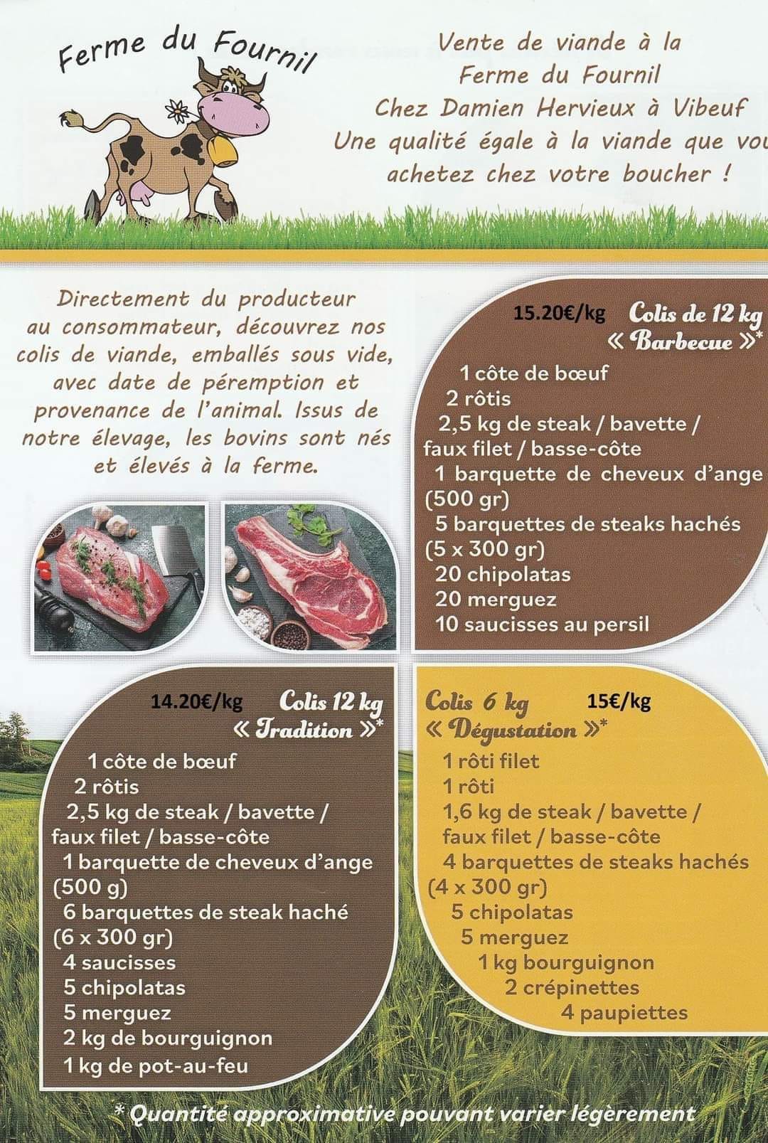 A la Ferme du Fournil vous pouvez commander des colis de viande rouge et de veaux de lait issu d'animaux nés et élevés à la ferme dans des conditions respectant le bien être de l'animal et l'environnement.
