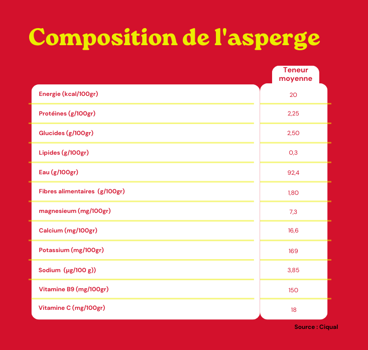 Les asperges sont riches en vitamines et minéraux. Elles sont composées de vitamine A, C, K, B1, B2, B6 et surtout B9. La vitamine B9, aussi appelée acide folique, est recommandée chez les femmes enceintes pour limiter le risque de malformations du système nerveux chez le fœtus. Riche en calcium, potassium et sodium, l’asperge permet de soutenir le système immunitaire et de garder une bonne santé globale.