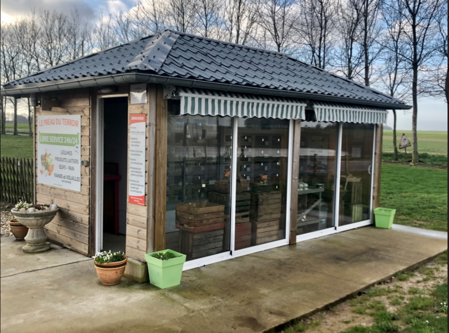 Le préau du terroir propose des produits de la production de la ferme Hortensias : pommes de terre, carottes, poireaux, œufs, jus de pomme… ainsi que des produits laitiers d’autres producteurs locaux : fromage, yaourt, beurre….
