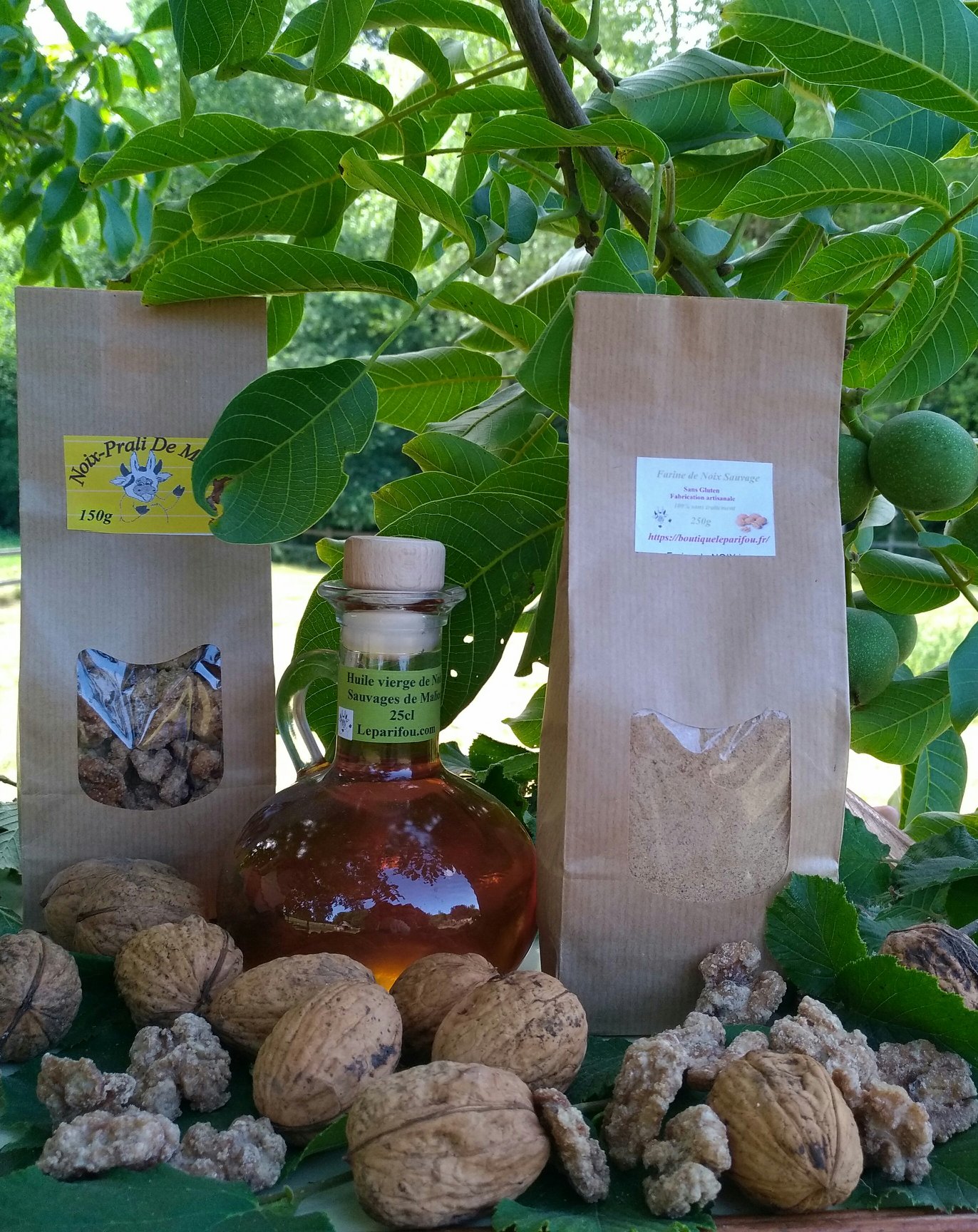 Huile de noix sauvages, huile de noisettes sauvage, farine de noix, farine de noisette, noix-Prali, Gât'aux noix, Choco-noix, Jus de pomme, Vinaigre de Framboise, coulis de Framboises, sirop de framboise....