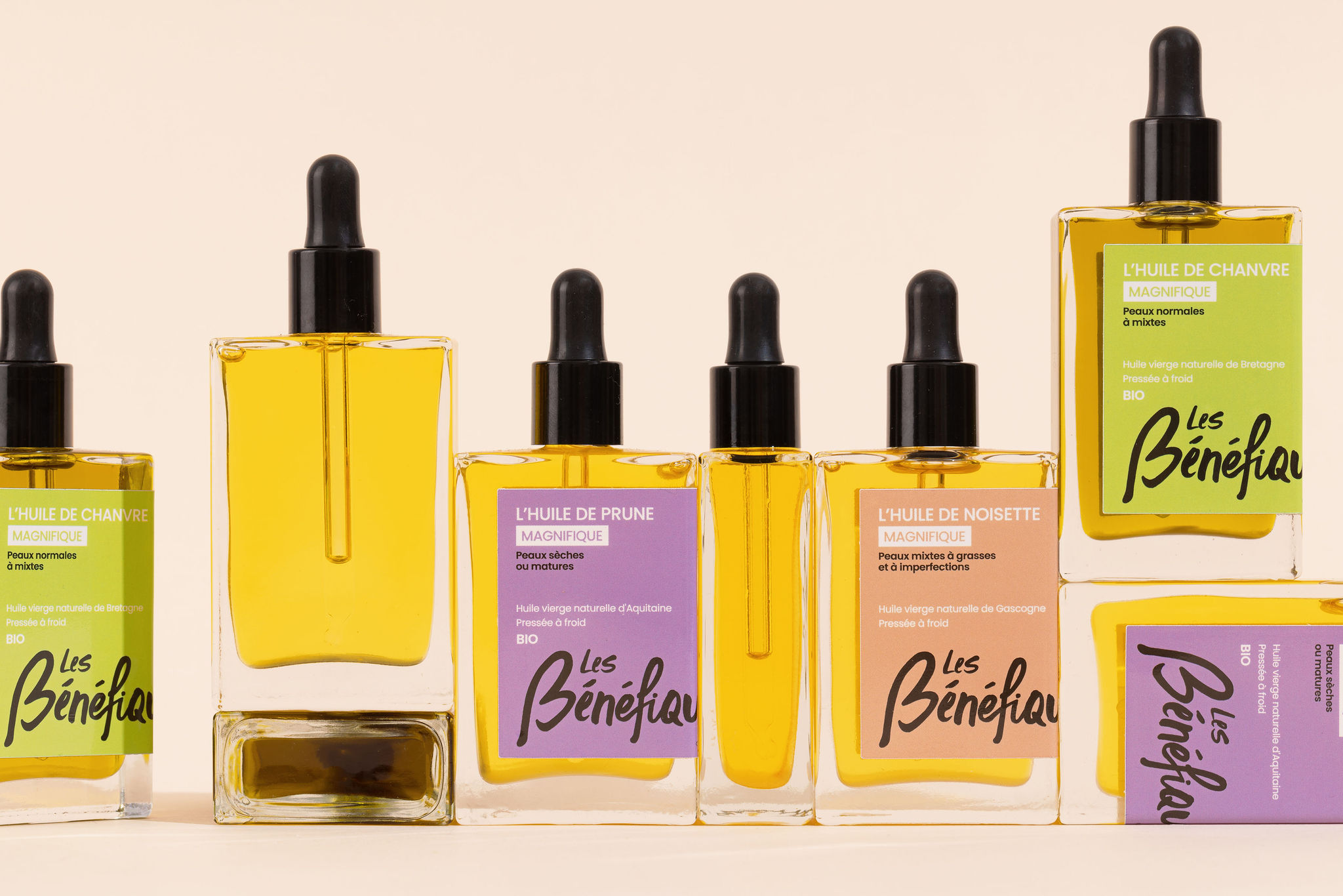 - des huiles de soin multi-usages pour chaque type de peau : huile de noisette de Gascogne, huile de chanvre de Bretagne et huile de prune d'Aquitaine ;