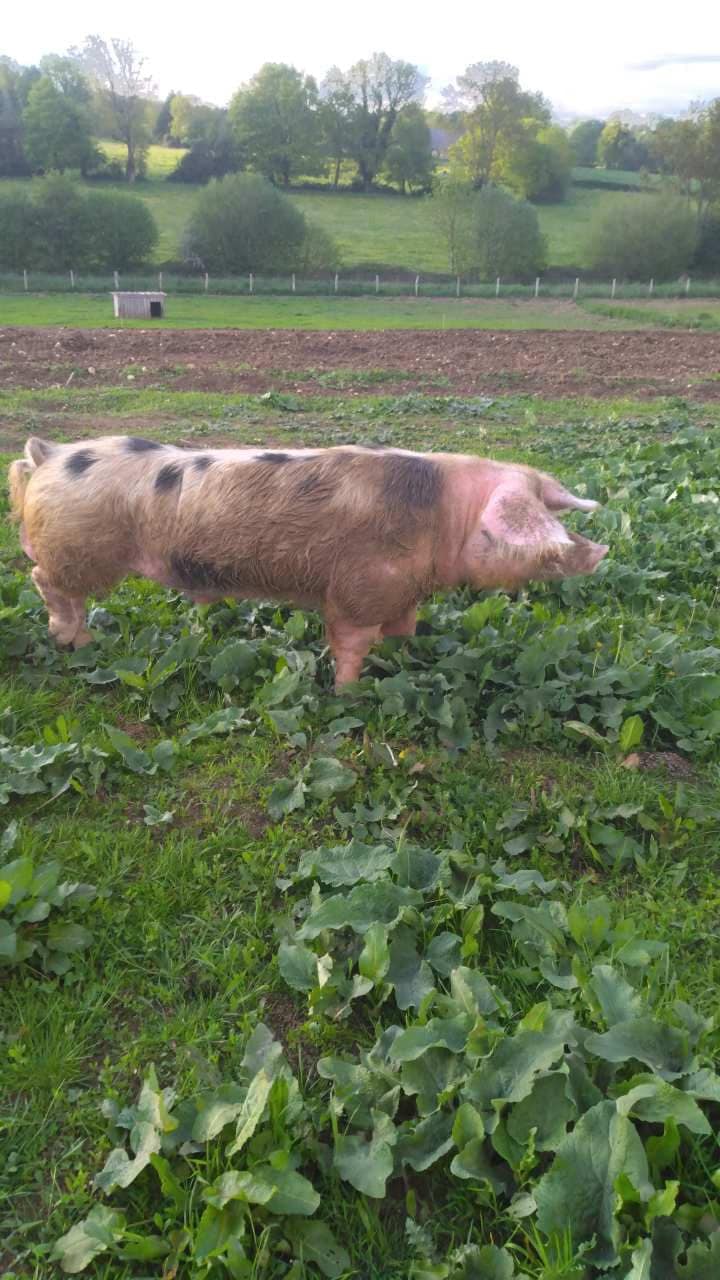 Aujourd’hui son exploitation représente 77 hectares et 150 porcs de Bayeux, qui sont nourris à l’herbe, à l’orge, au blé et aux petits pois, produits sur la ferme.