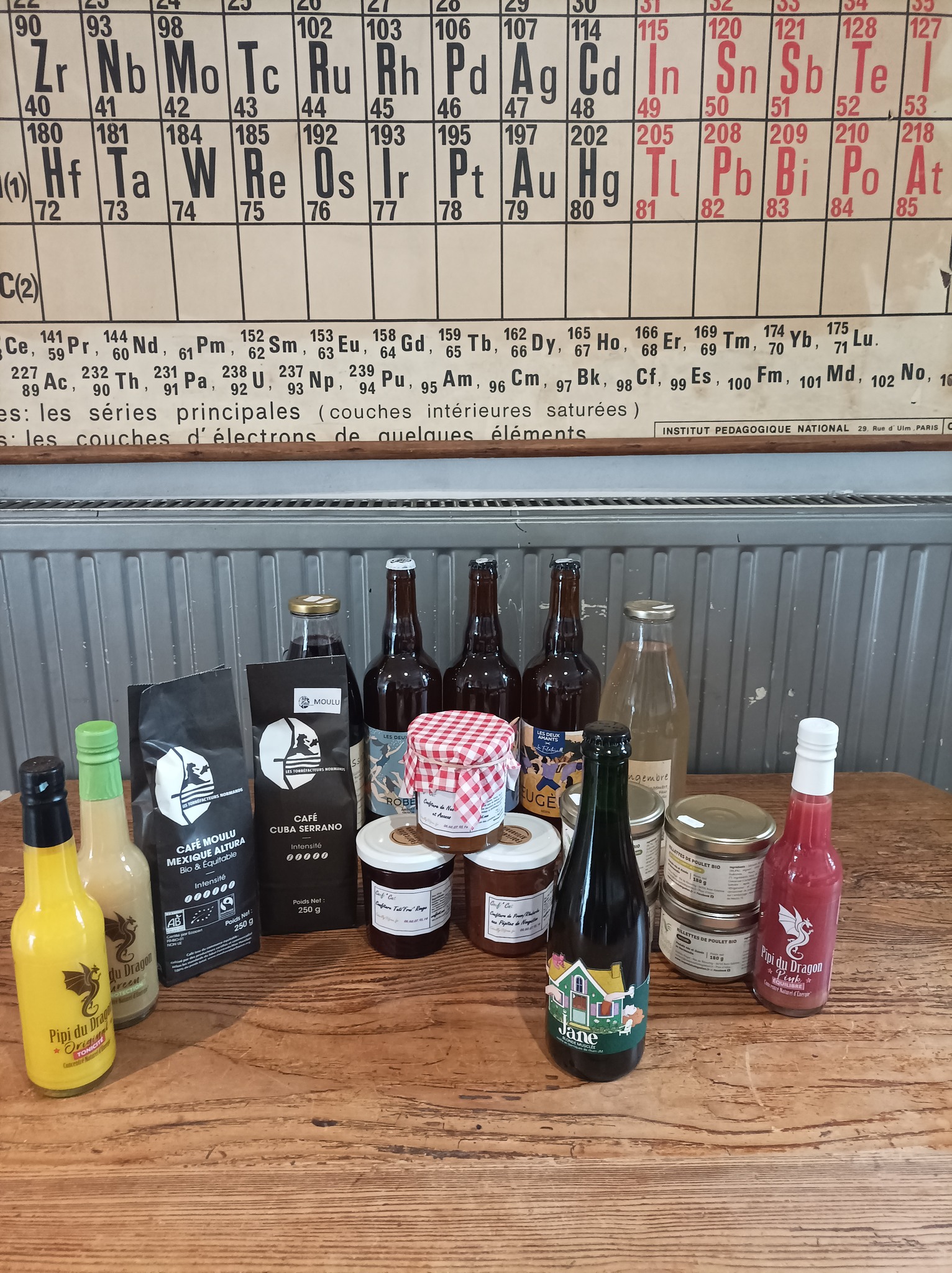 Café bio et local , bières à la pression locale également et une carte de jus du coin également.