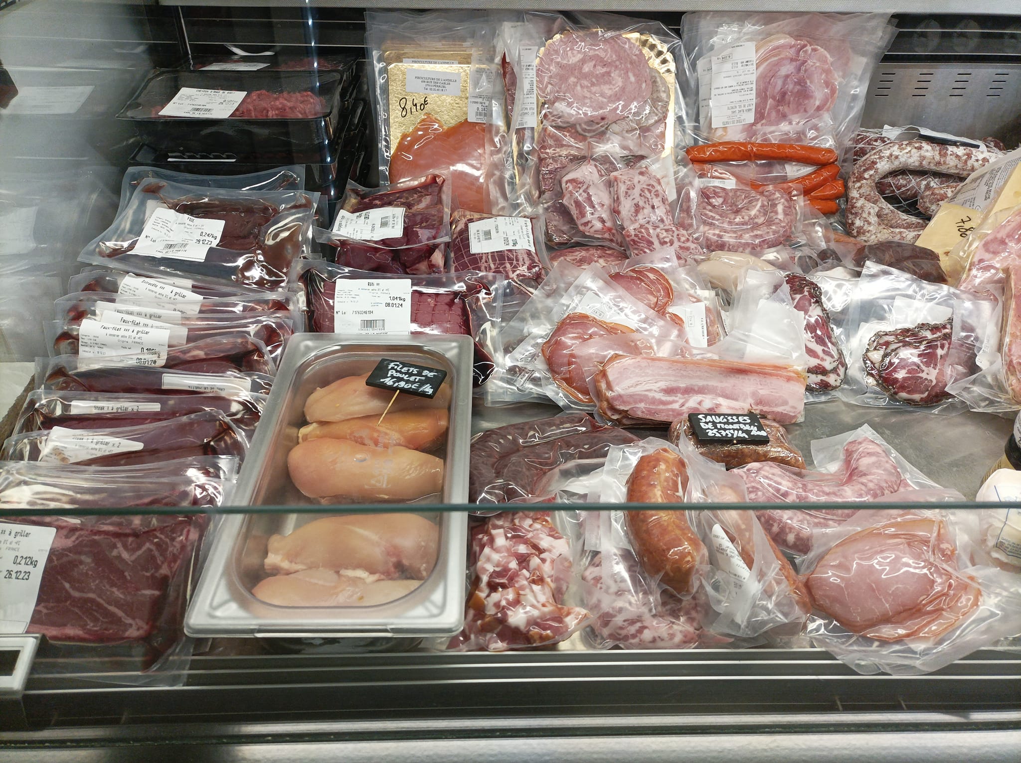 Côté épicerie , nous proposons des produits de dépannage et une variété de produits locaux ( viandes , produits laitiers , fruits et légumes , conserves , boissons , vrac ...)