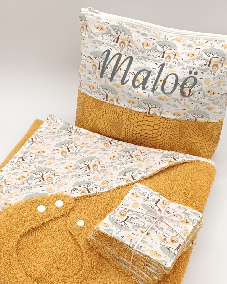 Composez vos ensembles selon vos envies : sortie de bain, grands bavoirs, bavoirs "bandanas", lingettes lavables, trousse de toilette, protège carnet de santé, trousse à maquillage, étui à brosse à dent, étuis à lunettes, des charlottes alimentaires ...