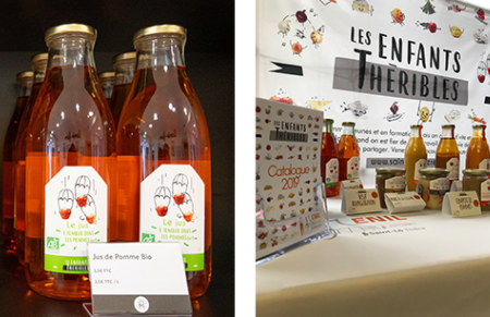 Sur l’atelier, nous fabriquons des fromages, des yaourts, du jus de pomme, des conserves etc. commercialisés sous la marque Enfants Thèribles.