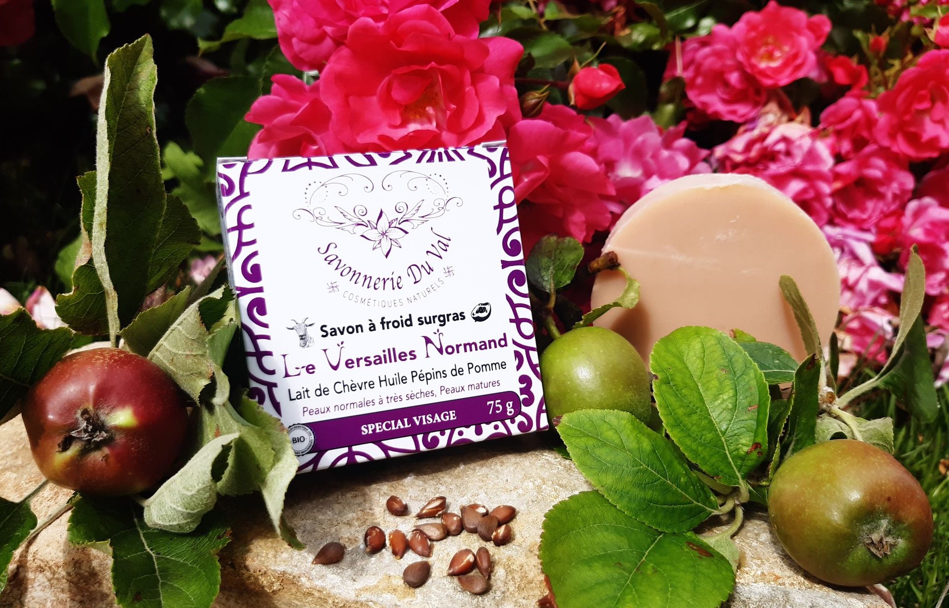 La spécialité de la Savonnerie Du Val, ce sont ses savons et cosmétiques naturels à base d’huile de pépins de pomme, une huile rare et précieuse, véritable trésor et douceur de la nature possédant une action raffermissante et lissante, elle est un puissant anti-oxydant.