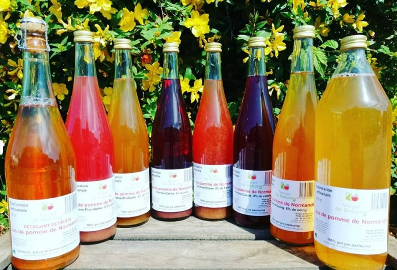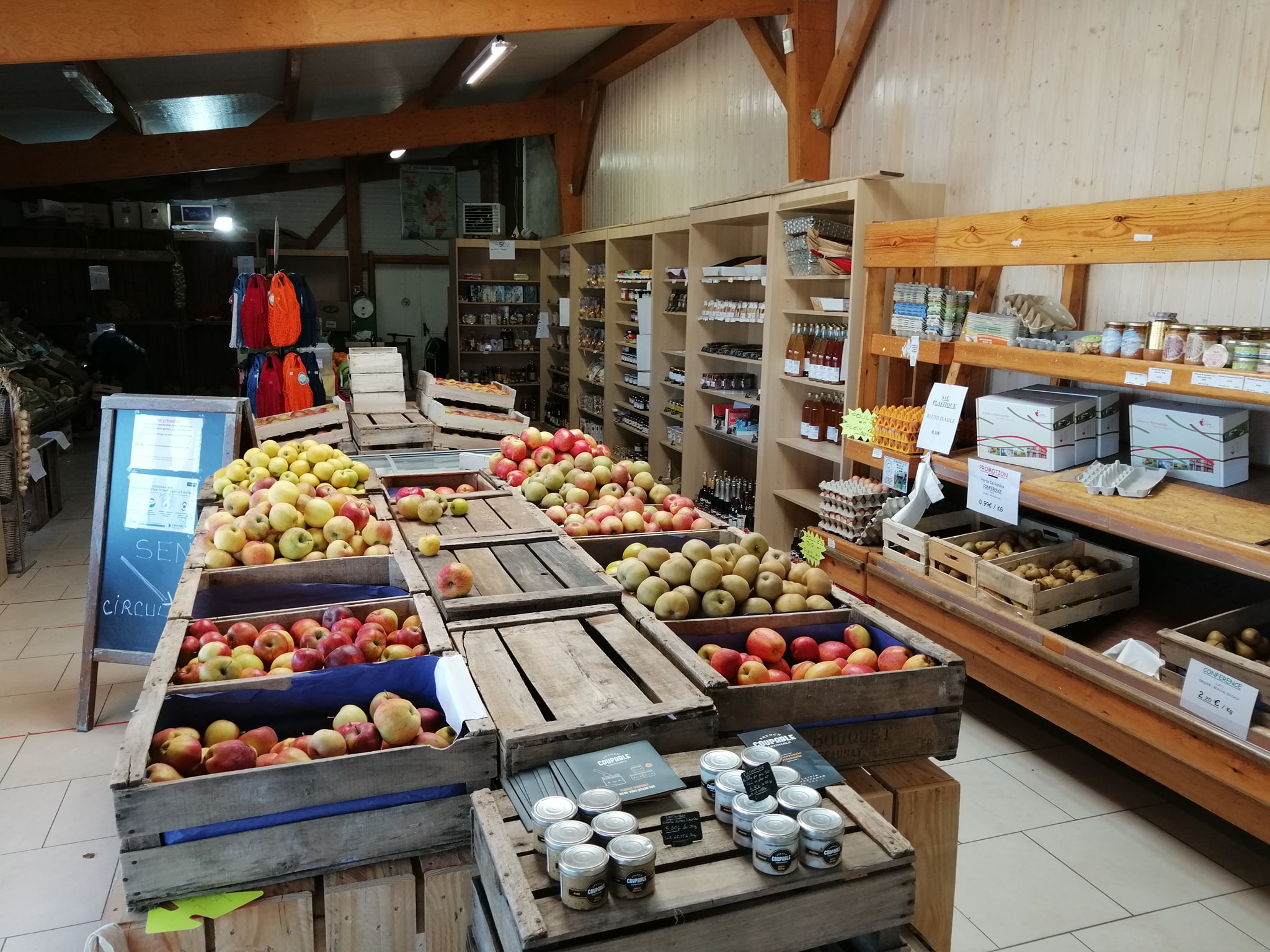Produits proposés en magasin : Pommes et poires produites au verger à Beauval en Caux (76890), ainsi que des légumes, viande, fromage, jus de fruit, cidre et autres produits issus au maximum de productions locales ou régionales en circuit court.