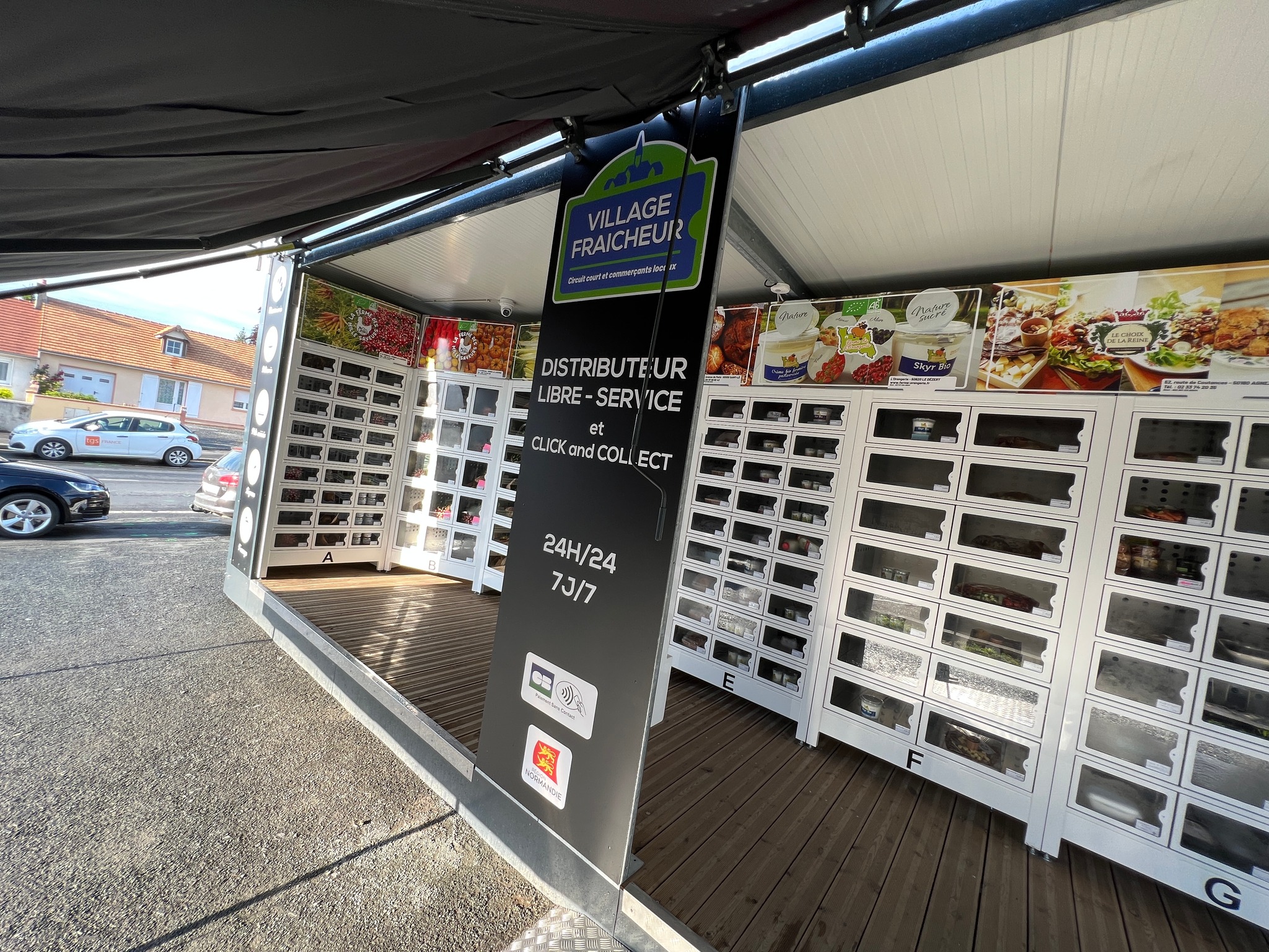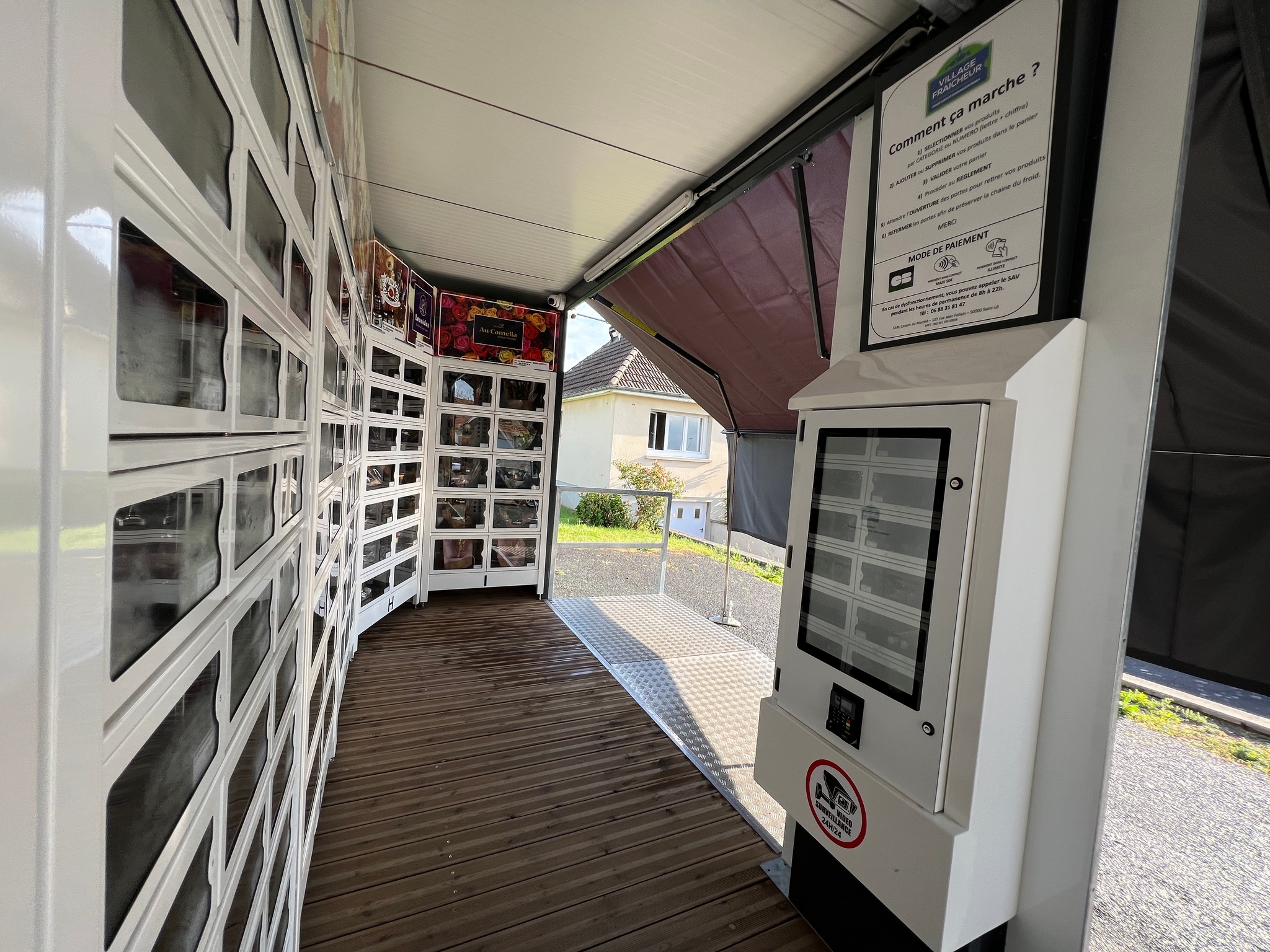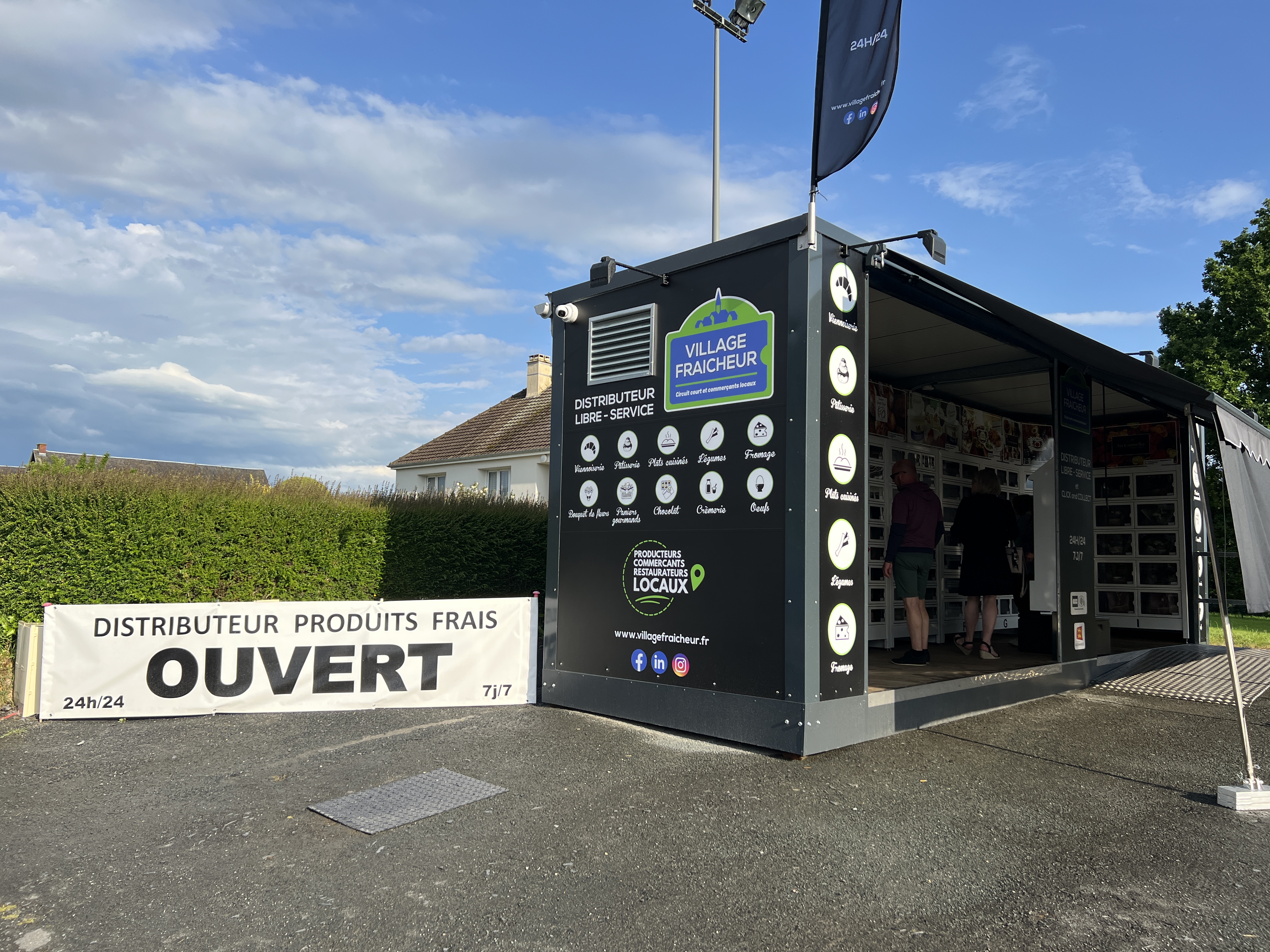 Village Fraicheur est un distributeur automatique à casiers qui regroupe les produits de producteurs, artisans, commerçants et restaurateurs locaux.